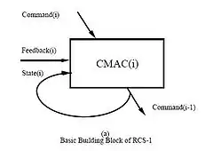 CMAC стає державною машиною, коли деякі з його виходів подаються безпосередньо на вхід, тому RCS-1 був реалізований як набір державних машин, розташованих в ієрархії рівнів управління. На кожному рівні команда введення ефективно вибирає поведінку, яка управляється зворотним зв'язком в стилі стимул-реакція. CMAC, таким чином, став еталонним зразком будівельного блоку RCS-1, як показано на рисунку.