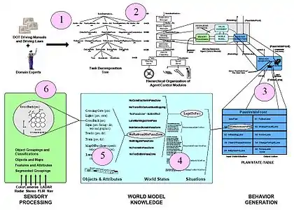 Ієрархія цих будівельних блоків використовувалася для реалізації ієрархії поведінки, що спостерігається Тінбергеном[7] та іншими. RCS-1 багато в чому схожий з архітектурою підзарядки Брукса,[8] за винятком того, що RCS вибирає поведінку до факту через цілі, виражені в командах, а не після факту через субсумпсії.[уточнити][2]