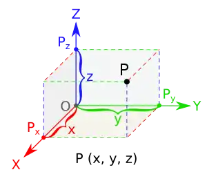 В тривимірній системі Декартових координат, точка P в xyz-просторі локалізується вже за допомогою трьох параметрів: .