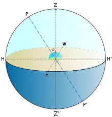 - (широта або полярний кут) — кут між додатною піввіссю z і відрізком, проведеним з полюса до точки P.