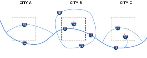 У наведеному вище прикладі місто А має парно пронумероване периферійне шосе. Місто В має периферійне кільцеве шосе з парною цифрою на початку та відгалуження з непарною цифрою. Місто С має периферійне шосе з парною цифрою на початку та відгалуження з непарною цифрою. Оскільки всі три міста в одному штаті кожна з допоміжних доріг має власний тризначний номер[39]. На відміну від головних інтерстейтів інтерстейти з тризначними номерами позначаються східний/західний або південний/північний в залежності від загальної орієнтації дороги без зв'язку з номером дороги. Для деяких закільцьованих шосе використовуються для позначень внутрішній/зовнішній напрямок (англ. inner/outer directions) на противагу до назв напрямків за сторонами світу.
