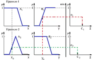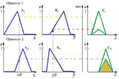При цьому, для визначення результату нечіткої кон'юнкції або зв'язки «І» може бути використана одна з формул: