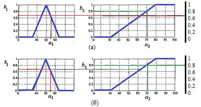 Припустимо, що поточна швидкість автомобіля дорівнює 55 км/год, тобто , а температура кави дорівнює 70°, тобто . Тоді агрегування першого нечіткого висловлювання з використанням операції нечіткої кон'юнкції дає в результаті число (наближене значення), яке означає його ступінь істинності та визначається як мінімальне зі значень 0.67 та 0.8 (рис. 2, а). Агрегування другого нечіткого висловлювання з використанням операції нечіткої диз'юнкції дає в результаті число , яке означає його ступінь істинності та визначається як максимальне зі значень 0.67 та 0.8 (рис. 2, б).