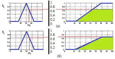 На рисунку 8 видно, що виходами правил є функції: та . Таким чином, результат дефазифікації обчислюється наступним чином: