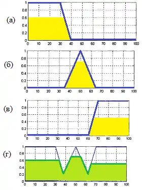 Акумуляція цих функцій належності шляхом max-об'єднання нечітких множин дозволяє отримати в результаті функцію належності вихідної лінгвістичної змінної «швидкість руху автомобіля», яка представлена на рис. 4 (г).