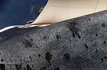 - Повстяне ізоляційне покриття багаторазового використання. Біле повстяне покриття Номекса знаходиться на верхньому люці відсіку корисного навантаження, ділянками на середній частині фюзеляжу та на штиблетах, на поверхні надкрилок і на гондолі системи орбітального маневрування. Використовується у випадку, якщо температури не піднімаються вище 371 °C (700 °F).