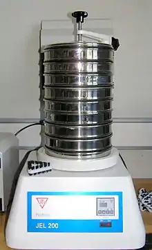 Ситовий вібраційний аналізатор (на фото) призначений для розсіву проб сипких матеріалів сухим та мокрим способами, а також для визначення їх гранулометричного складу з використанням стандартного набору сит.