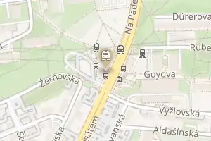 Конструкція станції — колонна трипрогінна мілкого закладення (глибина — 9,25 м) з однією острівною платформою, висота — 4,05 м. Колійні стіни станції викладені глазурованими цеглинами білого, синього і темно-коричневих кольорів. Будівництво станції в 1987—1990 роки склало 291,8 млн чеських крон. З боку станції «Страшніцька» розташован протівошёрстний з'їзд, який використовувався для обороту поїздів, до 2006 року.