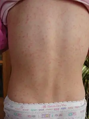 ![]() Висип на шкірі спини у дитини, хворої на скарлатину Висип на шкірі спини у дитини, хворої на скарлатину | |