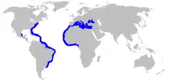Поширений у прибережних водах Атлантики. У західній Атлантиці від півдня Нової Англії (США) і Бразилії до Аргентини. У східній Атлантиці від Португалії до Амбріза (Ангола) (Середземне море включно, також у Чорному морі і біля Мадейри і Канар).