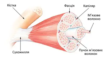 Поперечні смуги, які можна спостерігати в мікроскоп, зумовлені наявністю скоротливих білків у саркоплазмі, які структуровані в чіткому порядку. Структурно-функціональною одиницею м'язового волокна є саркомер.