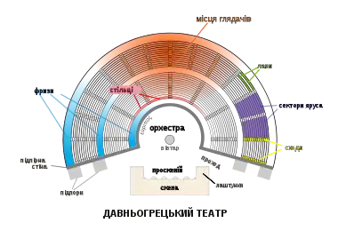 Спочатку — приміщення, де переодягалися актори. З ускладненням театральної дії і введенням 2-го й 3-го акторів в 1-й половині 5 століття до н. е. скена стала споруджуватися за орхестрою або по дотичній до її окружності. Від давньогрецького слова skene через посередництво лат. scaena походить сучасне слово «сцена».