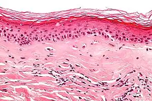 ![]() Мікрофотознімок субепітеліального склерозу (середня третина знімку). ГЕ Мікрофотознімок субепітеліального склерозу (середня третина знімку). ГЕ | |