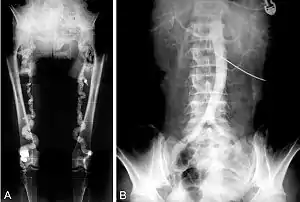 ![]() Ренгенографічне зображення вираженого кальцинозу низхідного відділу аорти та стегнових артерій Ренгенографічне зображення вираженого кальцинозу низхідного відділу аорти та стегнових артерій | |