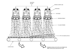 В бункер засипаються основні компоненти. Далі настає етап плавлення маси. Дозатори завантажують плавильну піч у строгій відповідності до рецептури, щоб при досягненні температури у 1400 °C, суміш мала задані механічні властивості для отримання якнайтонших ниток. Нитки отримуються при роздуванні струминою водяної пари або нагрітого стиснутого газу розплавленої скляної маси, що вилітає з центрифуги.