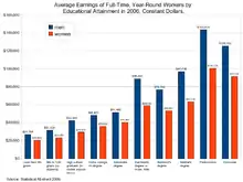 Гендерний розрив в оплаті праці — це різниця між середніми заробітками чоловіків та жінок за однакову роботу. У 2008 році ОЕСР навела дані, що середній заробіток жінок, зайнятих на повну ставку, був на 17 % нижчим, ніж заробіток їхніх колег-чоловіків, і що «30% варіації у розриві в заробітній платі чоловіків і жінок у країнах ОЕСР може бути пояснено дискримінаційними практиками на ринку праці».[29][30] Європейська комісія зазначила, що жіночий погодинний заробіток в 27 країнах ЄС у 2008 році був в середньому на 17,5 % нижчим за чоловічий.[31] Американський сайт «nationalpartnership.org» свідчить, що станом на квітень 2017, жінки в США в середньому отримують «80 центів за кожен долар, сплачений чоловікам», що відповідає гендерному розриву у середній річній зарплаті у понад 10 тис. дол. США[32].