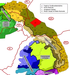 ![]() Сколівські Бескиди на мапі Карпат (червоний колір - с2) | ||||