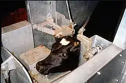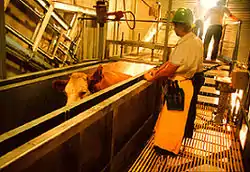 - Оглушування перед забоєм роблять різними способами, зокрема, електрооглушенням (для ВРХ — 300 В, 2 А, 50 Гц, для свиней — 200–250 В, 2400 Гц), механічним (пневматичним пістолетом, молотом), або газовою сумішшю (CO2 або N2O з повітрям). Цей етап, проте, заборонений нормами халяль (Шаріат) і кашрут.