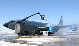![]() Протиобліднювальна обробка літака-заправника KC-135 «Стратотанкер» на злітній смузі авіабази. 29 січня 2009 | ||||