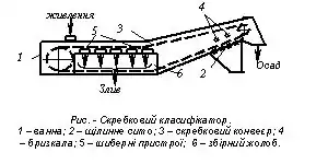 Скребкові класифікатори відстійного типу призначені для знешламлювання рядового вугілля і дрібного концентрату, а також для попереднього зневоднення дрібного концентрату відсаджувальних машин. Принцип дії скребкового класифікатора, як і елеваторного, оснований на осадженні грубозернистого матеріалу під дією сили ваги. К.с. являє собою металеву ванну 1 прямокутної форми з горизонтальною і похилою частинами (рис.). Пульпа завантажується в торцеву частину ванни класифікатора. Розділення на грубозернисту фракцію і шлам відбувається в горизонтальній частині ванни, а похила частина, у днище якої вмонтоване щілинне сито 2, служить для зневоднення осаду. Осад до місця розвантаження транспортується скребковим конвеєром 3 з перфорованими шкребками, що сприяє інтенсивнішому видаленню води з осаду. При проходженні над щілинним ситом для відділення шламів осад зрошується водою з бризкал 4. Злив, що містить шлам, видаляється через шиберні пристрої 5 у збірні жолоби 6, розташовані по обидва боки ванни. Висота рівня пульпи у ванні регулюється положенням шиберів, змонтованих на бічних стінках ванни. При питомому навантаженні 15-25 м³/годּм² скребкові класифікатори працюють ефективно, якщо вміст твердого в оборотній воді не перевищує 120 кг/м³. Переваги скребкового класифікатора – компактність конструкції, низька чутливість до коливань навантаження і порівняно висока ефективність класифікації (Е = 70–90 %). Недоліки – малий термін служби ланцюга конвеєра і заклинювання шкребків грудками матеріалу.