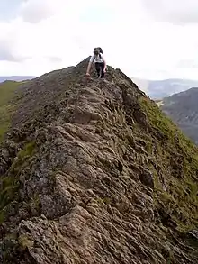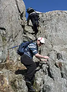 «Альпійський скремблінг — це позатрековий похід, часто по снігу або скелях, з 'нетехнічним' сходженням як кінцевою точкою маршруту. Нетехнічним сходженням є сходження, яке досягається без необхідності певних видів альпіністського спорядження (обв'язка, мотузки, захисної екіпіровки тощо), і не пов'язане з лазінням по крутих схилах або льодовиках. Проте, термін включає в себе перевали через скелі з невеликим кутом нахилу, трекінг по осипах, перетин водних потоків, продирання через зарості і ходіння по засніжених схилах.»
