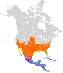 Гніздовий ареал птаха включає Мексику та більшу частину США. Під час зимівлі він трапляється на півдні США, в Мексиці, Центральній Америці та островах Карибського басейну. Мешкає на ділянках відносно відкритої рослинності, у галерейних лісах, чагарниках, невеликих лісах і культурних угіддях.