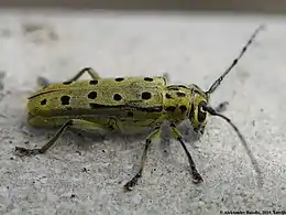 Жук завдовжки 12-20 мм.[2] Забарвлення сіро-зелене або жовтяво-зелене. На передньоспинці є дві пари чорних плям, а на надкрилах ще п'ять пар таких плям. Таож на боках є по одній плямі та чорна смуга. Вусики такої ж довжини як тіло. Кожен членик вусиків зеленого кольору з чорним наконечником.
