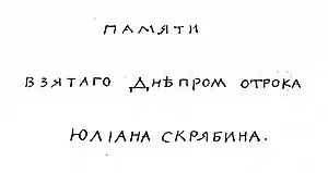 Коли тринадцятирічний[комм. 9] Юліан, великий маленький музикант, син Олександра Скрябіна, потонув у дніпровському вирі, ніхто не чув жодного звуку, хоча від інших його відокремлював лише порослий чагарником острівець — завбільшки з мою долоню, — і його вчителька музики, піаністка Надія Голубовська, говорила мені пізніше, що Юліан просто не вмів кричати — вона добре знала хлопчика[39].— Марина Цвєтаєва
