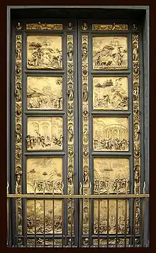 У перших воротах він зберігає тему квадрифолія, дотримуючись схеми Андреа Пізано, а на інших зображено всього 10 епізодів в прямокутному обрамленні. У першому варіанті двері — декоративне доповнення до будівлі, в другому вже — службова функція відходить на другий план, і двері є сукупністю історичних зображень. Рельєфи перших дверей — сцени виконані з урахуванням складної конфігурації рам. Усередині світлового поля сцени створюють згусток інтенсивного світла, що забезпечує ідеальні умови для композиції і пластичного розвитку сцени, гармонійного поширення світла. Над другими дверима Гіберті почав працювати, ґрунтуючись на сюжетах гуманіста Леонардо Бруні, і лише в ході роботи скоротив програму і змінив форму панно. Квадратна форма руйнує площину двері, робить рельєф «вікном» у зовнішній світ[6].