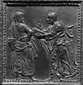- Гіберті: зображує всі деталі легенди, всіх дійових осіб. Класичним зразком йому служить «Жертвоприношення Іфігенії», і алегоричне тлумачення історичного факту — відмова від батьківської любові заради покори вищому боргу. Він представляє не драму, а древній обряд. Фігури задрапіровані, вівтар прикрашений класичним рельєфом. Відстороненість за часом знижує в очах глядача напругу пристрастей. Ісаак ідеально складений, жести Авраама витончені. Історія розвивається повільно, так як оку є на чому затриматися. Є ритмічна пауза, утворена діагональною скелею; вона ж служить відбивачем світла, який висвітлює обидві частини. Ця лінія узгодить один з одним дві орбіти, за якими розвивається рух — дугу тіла Авраама і дугу шиї осла. Динамічні ритми знаходять відображення в складному малюнку обрамлення: рух не зосереджується в одній дії, а розсіюється по всьому освітленому полю рельєфу[5].