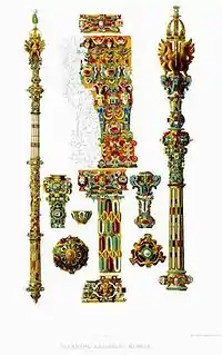 | «Скипетр золот чеканной с розными финифты и с каменьи, с алмазы и с яхонты червчатыми и с изумруды; наверху три орла пластанных крылами вместе, с финифты; по верху орлов корона, на короне на спне камень яхонт лазорев, на нем зерно гурмицкое. Со скипетра снят яхонт лазорев, а в то место положен изумруд» |