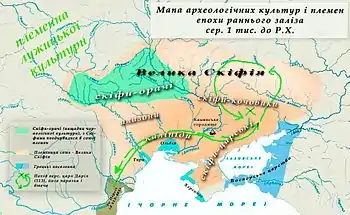Скі́фи, або ски́ти[1] (грец. Σκύϑαι; самоназва «сколоти»: грец. Σκολότοι), — екзоетнонім грецького походження, який у сучасній науковій та художній літературі застосовується до практично всіх племен, що мешкали у VII—III ст. до н. е. на землях сучасної України від Дунаю до Дону, всю цю територію Геродот називав Велика Скіфія. На землі нинішньої України скіфи прийшли у VII столітті до нашої ери, перетнувши Кавказ і захопивши Кімерію, та частково витіснивши в закавказзя та Малу Азію, та асимілювавши кімерійський етнос і стали домінуючою силою в степах та лісостепах на північ від Понту.