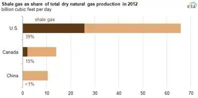 Частка вироблюваного там сланцевого газу постійно збільшується, що може привести до істотних змін в розподілі світового ринку газу між країнами. Підготовчі роботи з видобутку сланцевого газу ведуться в багатьох країнах світу. Перша газова свердловина в сланцевих пластах була пробурена в США ще в 1821 році. Ініціаторами масштабного виробництва сланцевого газу в США є Джордж П. Мітчелл і Том Л. Уорд.