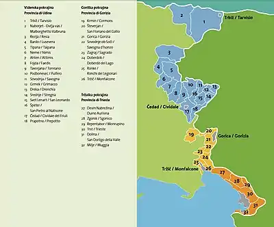 В 2001 році був прийнятий закон про захист словенської етнолінгвістичної автохтонної меншини. За словенською мовою було закріплене використання в адміністративних і судових установах, на цій мові дозволялося подавати запити в офіційні структури й отримувати відповіді. Даний закон обов'язковий для тих громад, де словенці складають більше 15 % виборців, або не менше третини муніципальної ради. Невдовзі у регіоні з'явилися двомовні дорожні вказівники.