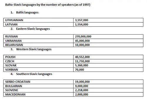 Чисельність носіїв сучасних балтійських та слов'янських мов станом на 1997 рік[9] показана у таблиці.