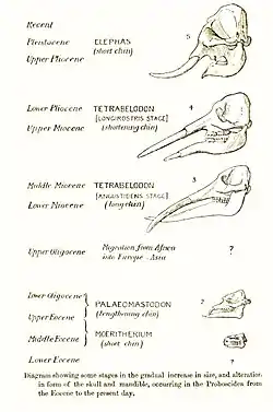 У ранньому олігоцені, 30–36 млн років тому, палеомастодон та фіомія мали схожий до сучасного слона вигляд, збільшений розмір тіла (висота плечей до 2 м), чіткі верхні та нижні бивні, короткий хобот. Напевно, вони харчувалися в лісистій місцевості високорослими рослинами. Специфічний адаптивний комплекс характерних рис слонів розвивалися протягом всього перебігу еволюції хоботних. Тіло, яке збільшилось до масивних пропорцій, підтримувало величезну кишку для перетравлення великої кількості несвіжої низькорослої рослинності. Масивні кутні зуби і тяжкі бивні підтримуються дуже великою головою, яка кріпиться на дуже короткій шиї, полегшуючи тим самим проблему її рухливості. Але з головою, високо піднятою над землею, короткою шиєю і тяжкими іклами, харчуватися ротом (особливо низькорослими рослинами) було б складно; звідси поява хобота.