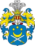 Щит увінчаний дворянським нашоломником і короною. Нашоломник: три страусиних пера. Намет на щиті червоний, підкладений сріблом.