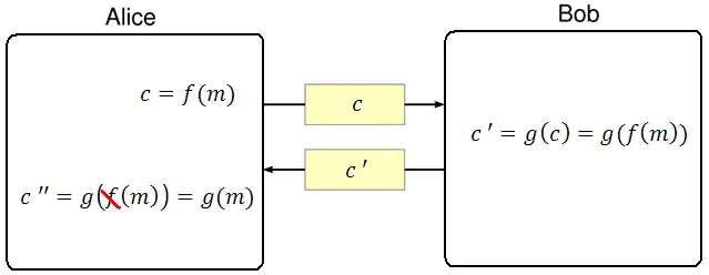 - Аліса зашифровує повідомлення функцією ., отримуючи зашифроване повідомлення .