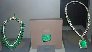 Зліва направо: індійське смарагдове намисто, смарагд Гачала (858 карат) і смарагдове намисто Маккей (в центрі — 167-каратний смарагд). Національний музей природознавства (Вашингтон, США)