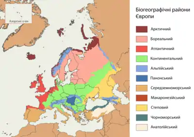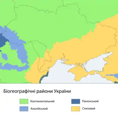 Територія України розподіляється між континентальним біогеографічним регіоном (приблизно збігається із Поліською та Лісостеповою кліматичними зонами), степовим (збігається із Степовою кліматичною зоною та зоною субтропіків у Гірському Криму), альпійським (Українські Карпати) та паннонським біогеографічним регіоном, до якого входить рівнинна частина Закарпатської області.