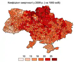 У 2014 році в Україні[7] померло 632,3 тис. осіб, що становить 14,7 випадків на 1000 осіб. У регіонах показник смертності коливався від 10,4 на 1000 у Києві до 19,2 у Чернігівській області. Найвищі показники смертності характерні для північно-східних районів Чернігівської та Сумської областей, де найбільш виражений процес старіння населення і де коефіцієнт смертності перевищує 25 осіб на 1000.[4]