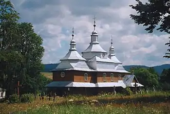 У своєму плануванні церква дерев'яна, тризрубна, триверха. Її спорудив відомий у Бескидах майстер Лука Снігур у 1874. Унікальністю церкви є закінчення двох бічних об'ємів: перехід від восьмерика до четверика відбувається за допомогою трикутних парусів, що надають храму типово бойківського пірамідального характеру. Церкву оточує піддашшя; з південного боку східного зрубу добудовано приміщення. Уся церква вкрита бляхою.