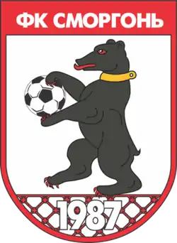 Емблема футбольного клубу «Сморгонь» являє собою герб міста Сморгонь — танцюючий на розпечених прутах ведмідь, який тримає в лапах футбольний м'яч, в червоній оправі з написом вгорі «ФК Сморгонь» і з роком відродження клубу (1987) внизу.