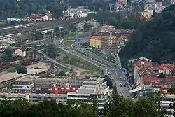 Біля броварні «Старопрамен» на вулиці На Книжеці (чеськ. Na Knížecí) розташована автобусна станція, звідки вирушають автобуси за маршрутами на південь і південний захід країни (наприклад, напрямки на Пісек, Пршибрам, Бероун, Пльзень, Рокицани, Страконице, Клатови, Сушице, Домажліце тощо). Приміські автобуси відправляються й від вокзалу «Прага-Сміхов».