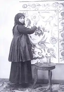 | Ганна Собачко на тлі своєї роботи, кустарна майстерня Семиградової, 1915 | ||||