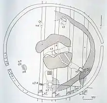 В рові зафіксовані два горизонти знахідок, пов'язаних з різними історичними періодами. У східного проходу на значній відстані на глибині 0,4—0,5 м від рівня давнього горизонту зустрічалися необроблені камені (вапняк, граніт), аналогічні використаним у вимостки половецького святилища. Залишки тризни скіфського часу в рові були у шарі затікаючого ґрунту на висоті 0,3—0,4 м від дна, на глибині 1,2—1,3 м від рівня давнього горизонту. У переважній більшості концентрувалися біля проходів: на відстані до 6 м на північ і до 14 м на південь біля західного і до 2—3 м в обидва боки біля східного.