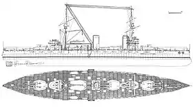 | Гармати | 4х3 305мм/52 , 20х1 130мм/55 , 5 75-мм гармат, 4 450-мм торпедних апарати 4х1 7.62-мм кулемети. | |