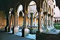 Арки підтримуються парними колонами, орнаменти яких чергуються, деякі з різьбленими завитками, і інші з інкрустацією мозаїкою. Капітелі розписані сценами з Біблії. Основи колон клуатру зображують найширші різні мотиви: стилізовані листя, розетки, лапи лева, групи людей і тварин, жаб і ящірок. Їх виконання має великі відмінності з виконанням капітелів тих же колон, що дозволяє припустити, що це було покладено на молодших майстрів. Капітелі груп з чотирьох кутових колон були орнаментовані особливо сильно. Походження майстрів вважається різним, від Іль-де-Франс і Провансу до Лангобардії в Апулії, як і виконання в різні періоди.