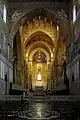 Величезний інтер'єр собору має форму латинського хреста з трансептом, який мало виступає і фактично є продовженням сторін пресбітерів бічних нефів. Нефи, кожен з яких закінчується напівкруглою апсидою, розділені між собою античними колонами з пульванами і капітелями, які мають зображення античних богів; колони підтримують стрільчаті арки арабського типу. Стеля колись була з відкритими балками і розписана в частині нефіа, а у середхресті колись мала аналог арабських мукарн; ця частина була перероблена в 1811 році після пожежі, яка знищила частину даху. Мозаїка підлоги була завершена в XVI столітті і складається з дисків з порфіру і граніту з мармуровими стрічками, які переплітаються в ламані лінії.