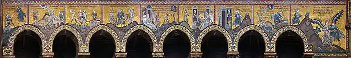 Мозаїки, що прикрашають собор, в основному (принаймні, на стінах середхрестя і центрального нефа) є ілюстраціями оповідань Старого і Нового Заповіту, включаючи різні біблійні епізоди, починаючи від семи днів Створення до заснування Церкви Христової на землі через Апостолів. Між цими зображеннями включені інші мозаїки з ієрархічним набором ангелів, святих та пророків.